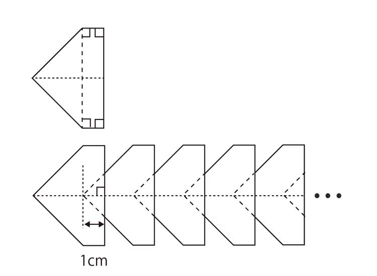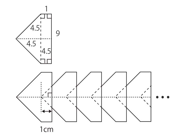 一辺が4.5㎝の直角二等辺三角形2つと、たて9㎝、よこ1㎝の長方形を組み合わせた五角形がある。この五角形を2つの二等辺三角形が重なるように折り目を付ける。この折り目が1㎝重なるようにのりではり、同じ五角形を100個ならべていく。この時、並べて出来た図形の面積を求めなさい。また、求め方を式と言葉で説明しなさい。