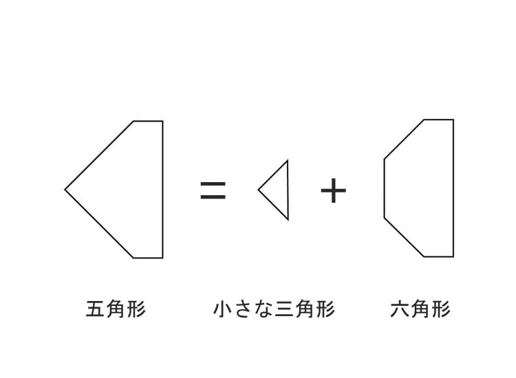 次は、一番左の五角形を小さい三角形と六角形に分けます。小さな三角形(重なり部分)の面積は