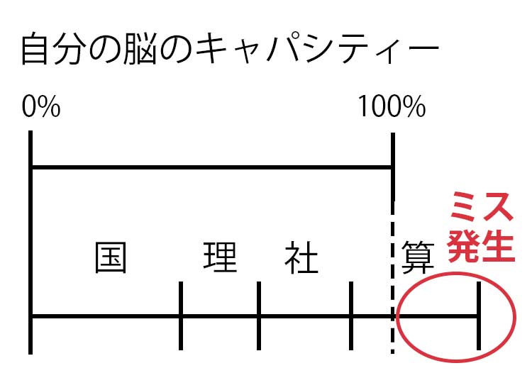 適性検査において、特に重要なのが脳機能の管理です。当塾ではこれを脳のキャパシティー管理と呼んでいます。複数の科目を引き出す適性検査と単一科目の試験の模試では脳の使い方が根本的に異なります。単一科目の試験では、よほどの難問や応用問題が連続しない限り、脳のキャパシティーを超えることは稀です。しかし、適性検査では、複数の科目を一度に処理しようとすることで、無意識のうちに脳のキャパシティが限界を突破してしまいます。